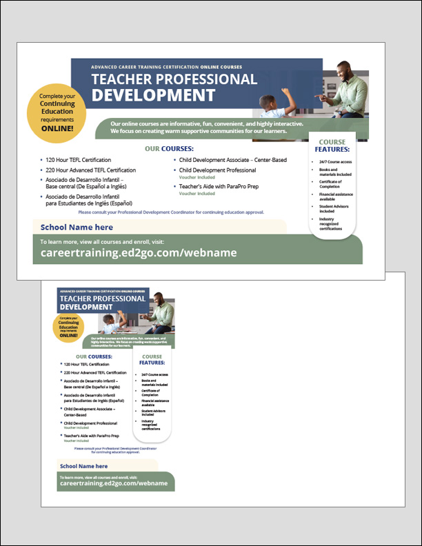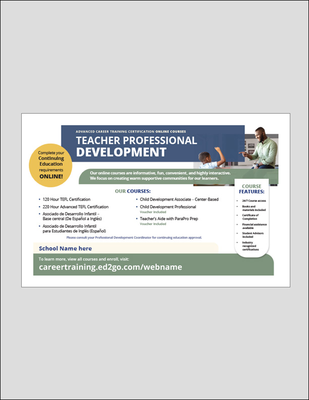 Use this flyer, print ad, and mailer to promote Teacher Professional Development Continuing Education Online Courses.
