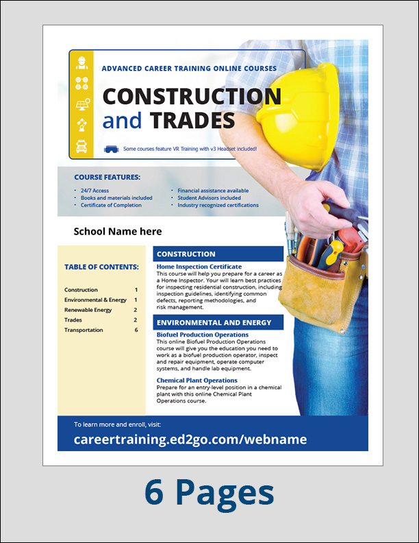 Use this catalog, with course descriptions, to promote Construction and Trades Advanced Career Training online courses in the following categories:
