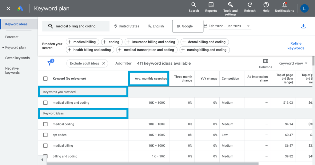 There is quite a bit of data in Keyword Planner, but the main sections we will be focusing on are “Keywords You Provided,” “Keyword Ideas,” and “Average Monthly Searches.”