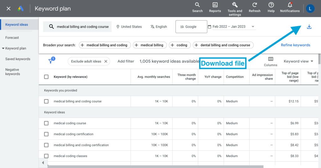 Open Keyword Planner and begin with a term that describes the specific content you want to create or the existing page you want to update. For example, say I want to create a medical billing and coding certification course page. When I enter the term “medical billing and coding course” into Keyword Planner, it generates a list of similar keywords and shows me how many people are searching for each keyword.
