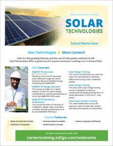 Use this flyer to promote Solar Technologies Advanced Career Training courses.